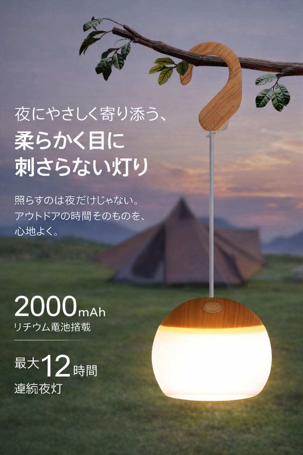 やさしく目に刺さらない光が特徴の充電式キャンプライトです。